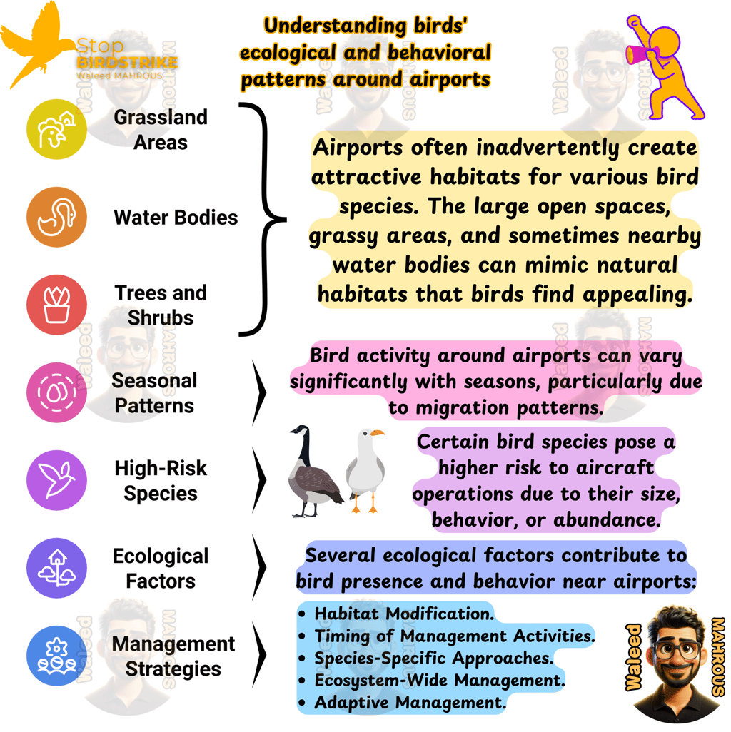 Understanding these fundamental aspects of bird behavior and ecology near airports has significant implications for developing effective management strategies:
